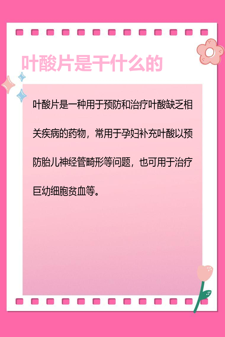 叶酸片是一种用于预防和治疗叶酸缺乏相关疾病的药物,常用于孕妇补充叶酸以预防胎儿神经管畸形等问题,也可用于治疗巨幼细胞贫血等。常见的叶酸片用途包括预防胎儿神经管缺陷、治疗巨幼细胞贫血、辅助治疗高同型半胱氨酸血症等。