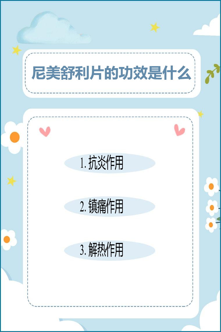 尼美舒利片是一种非甾体抗炎药,具有抗炎、镇痛、解热的作用,可用于慢性关节炎如骨关节炎等、手术和急性创伤后的疼痛、耳鼻咽部炎症引起的疼痛、痛经、上呼吸道感染引起的发热症状等。
