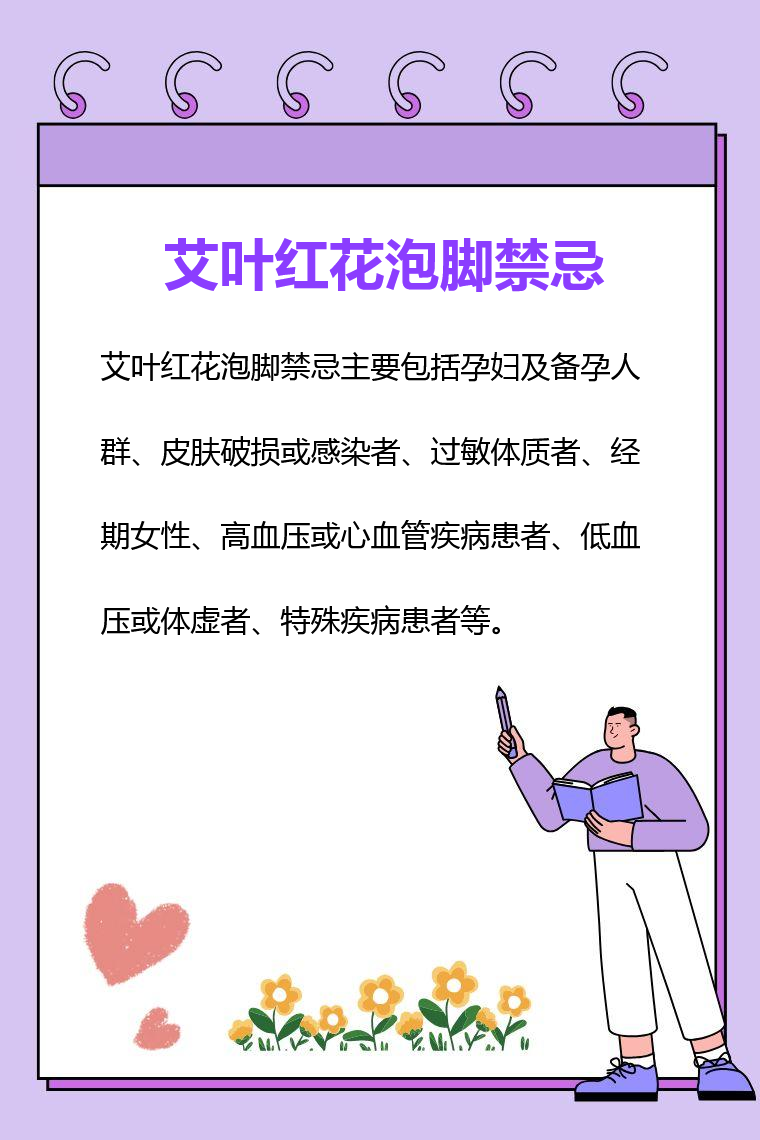 艾叶红花泡脚禁忌主要包括孕妇及备孕人群、皮肤破损或感染者、过敏体质者、经期女性、高血压或心血管疾病患者、低血压或体虚者、特殊疾病患者等。以下为具体禁忌内容: