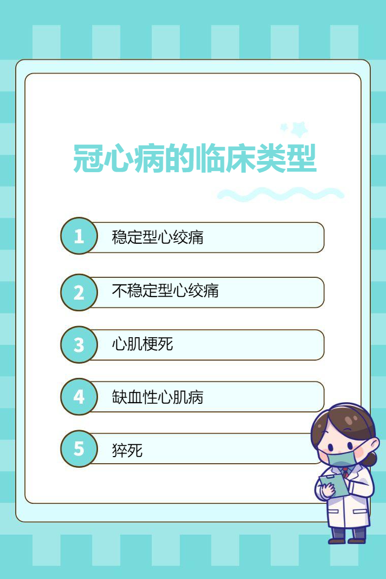 冠心病的临床类型主要包括稳定型心绞痛、不稳定型心绞痛、心肌梗死、缺血性心肌病、猝死等。
