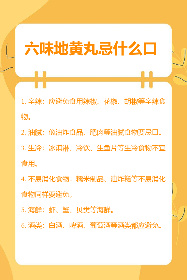 六味地黄丸服用时忌辛辣、油腻、生冷、不易消化食物、海鲜、酒类等。