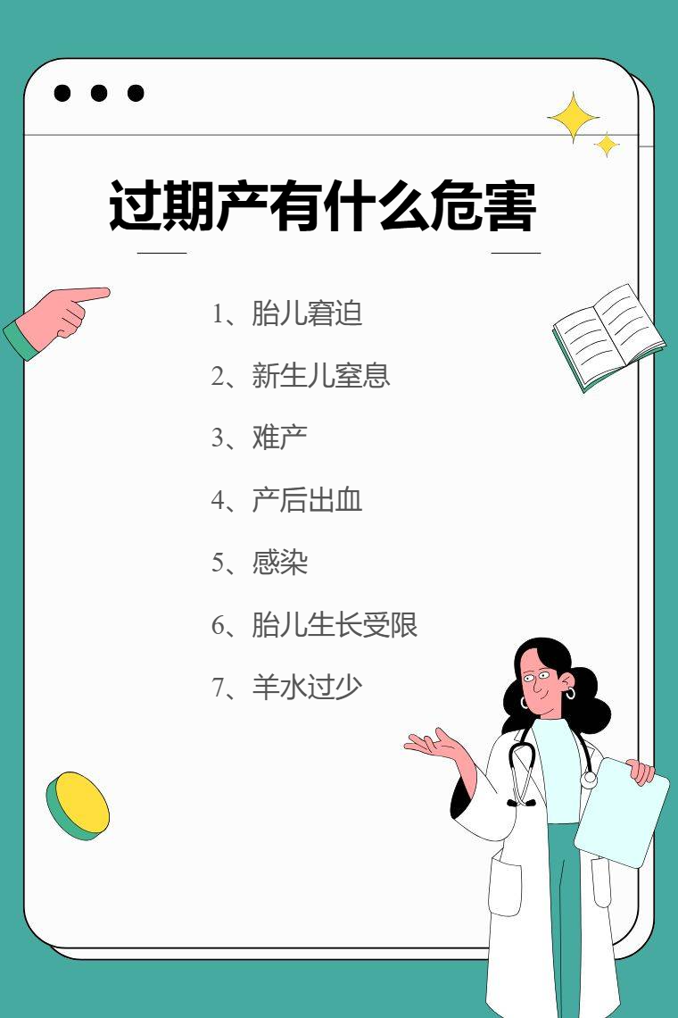 过期产是指妊娠超过42周分娩的情况,可能会给母婴带来一系列危害,包括胎儿窘迫、新生儿窒息、难产、产后出血、感染、胎儿生长受限、羊水过少等。