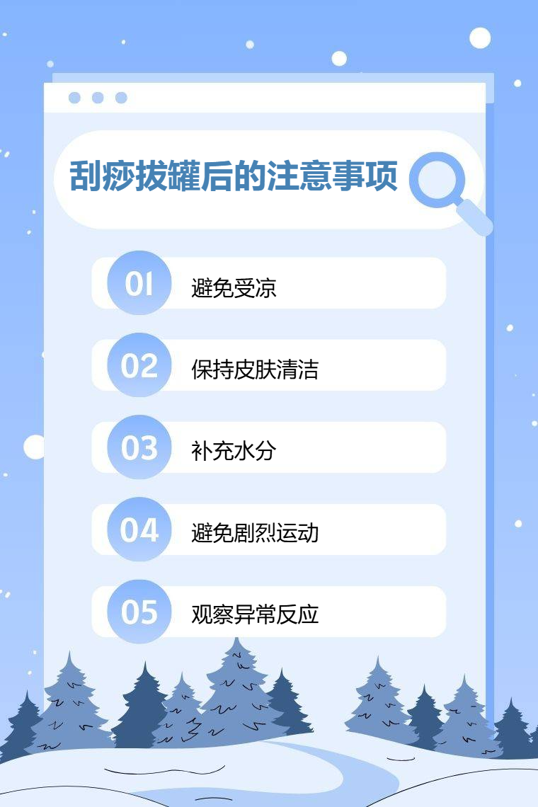 1. 避免受凉:刮痧拔罐后皮肤毛孔处于开放状态,寒气易侵入体内,需避免吹冷风、接触冷水或处于低温环境,建议穿着保暖衣物并远离空调直吹。