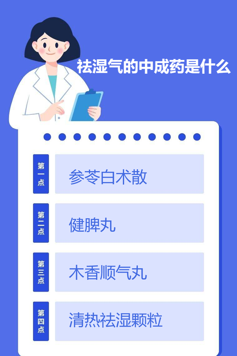 祛湿气的中成药有参苓白术散、健脾丸、木香顺气丸、清热祛湿颗粒等。