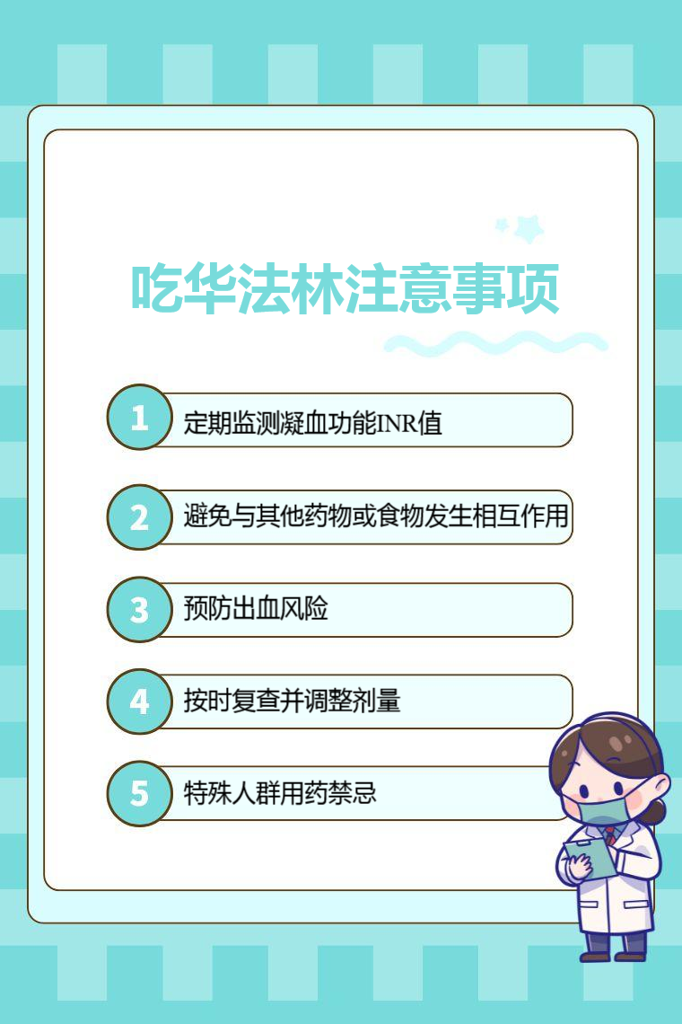 服用华法林需注意定期监测凝血功能INR值、避免与其他药物或食物发生相互作用、预防出血风险、按时复查并调整剂量、特殊人群用药禁忌等。以下为具体注意事项: