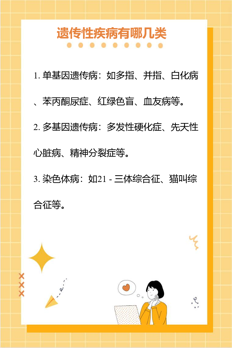 遗传性疾病主要有单基因遗传病、多基因遗传病、染色体病等。