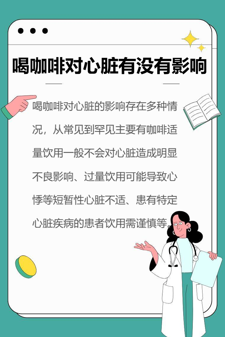 喝咖啡对心脏的影响存在多种情况,从常见到罕见主要有咖啡适量饮用一般不会对心脏造成明显不良影响、过量饮用可能导致心悸等短暂性心脏不适、患有特定心脏疾病的患者饮用需谨慎等。