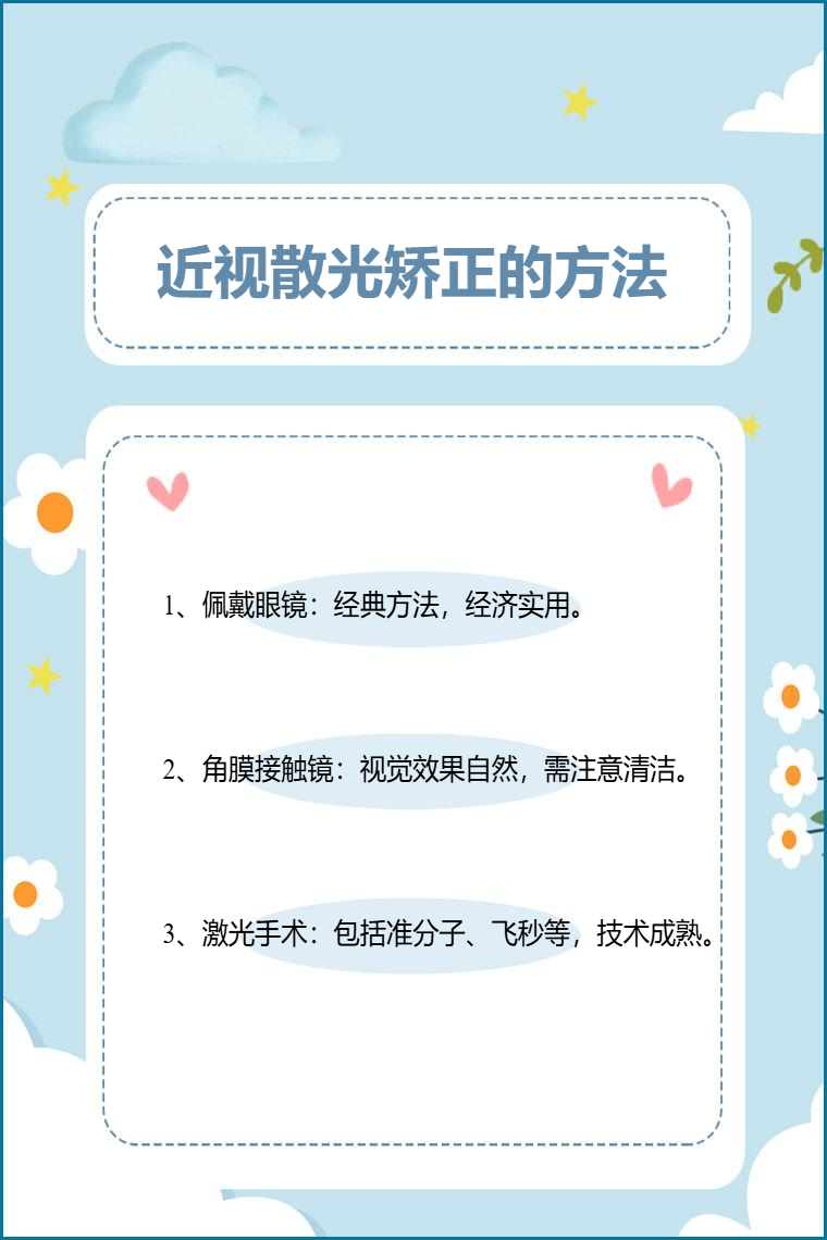 近视散光矫正的方法主要有佩戴眼镜、角膜接触镜、激光手术等。