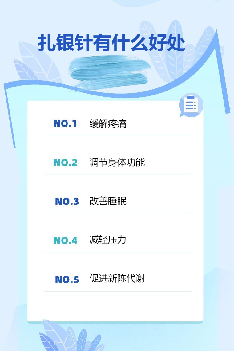 3. 改善睡眠:扎银针可以调节神经系统的兴奋性,帮助放松身心,改善睡眠质量,对于失眠、多梦等睡眠问题有较好的疗效。