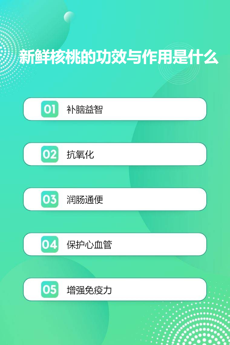 新鲜核桃中含有丰富的维生素 E 和多种抗氧化物质,这些成分可以清除体内的自由基,减少氧化应激对细胞的损伤,从而起到延缓衰老、预防癌症和心血管疾病等作用。