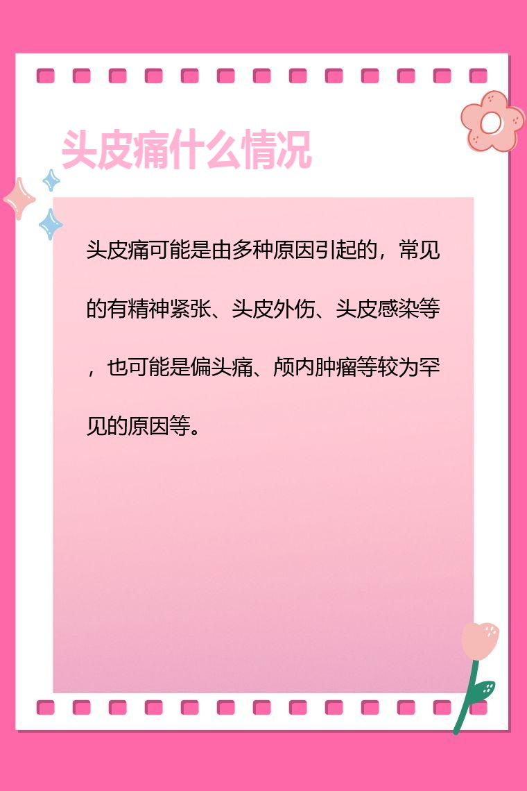 头皮痛可能是由多种原因引起的,常见的有精神紧张、头皮外伤、头皮感染等,也可能是偏头痛、颅内肿瘤等较为罕见的原因等。以下是具体情况:
