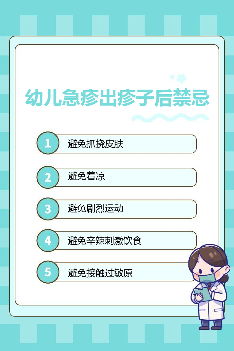 幼儿急疹出疹后需注意避免抓挠皮肤、避免着凉、避免剧烈运动、避免辛辣刺激饮食、避免接触过敏原等。