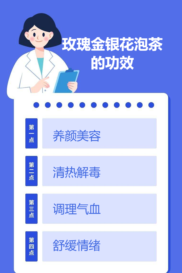 1. 养颜美容:玫瑰富含多种维生素和矿物质,能促进血液循环,使肌肤更加红润有光泽。金银花则具有抗菌消炎的作用,可帮助清除皮肤内的毒素,减少痘痘、粉刺等皮肤问题的出现,让肌肤保持健康状态,长期饮用有助于改善肤质,延缓皮肤衰老。