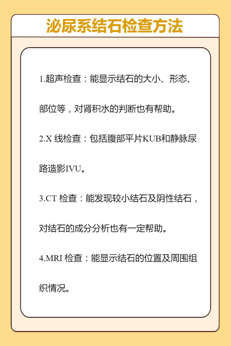 泌尿系结石检查方法主要有超声检查、X 线检查、CT 检查、磁共振成像MRI检查等。