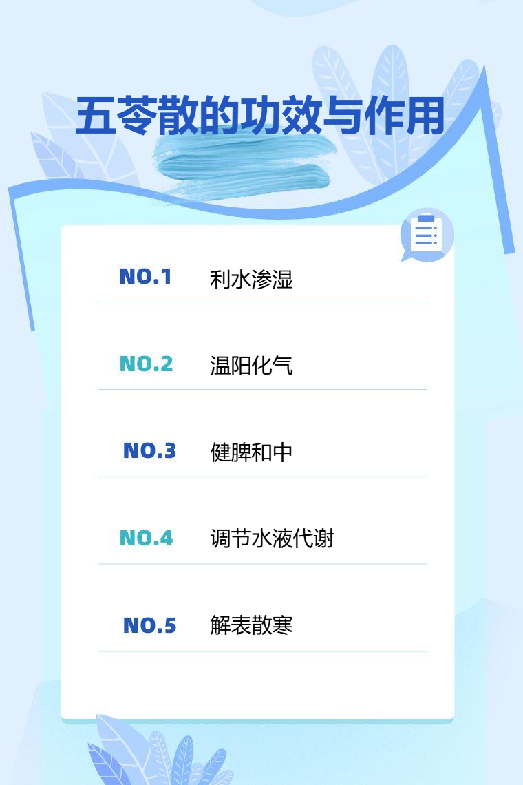 1. 利水渗湿:五苓散通过茯苓、泽泻等成分促进尿液生成与排出,适用于水肿、小便不利、尿频尿急等水湿停滞证候,尤其对下肢浮肿或晨起面部水肿效果显著。