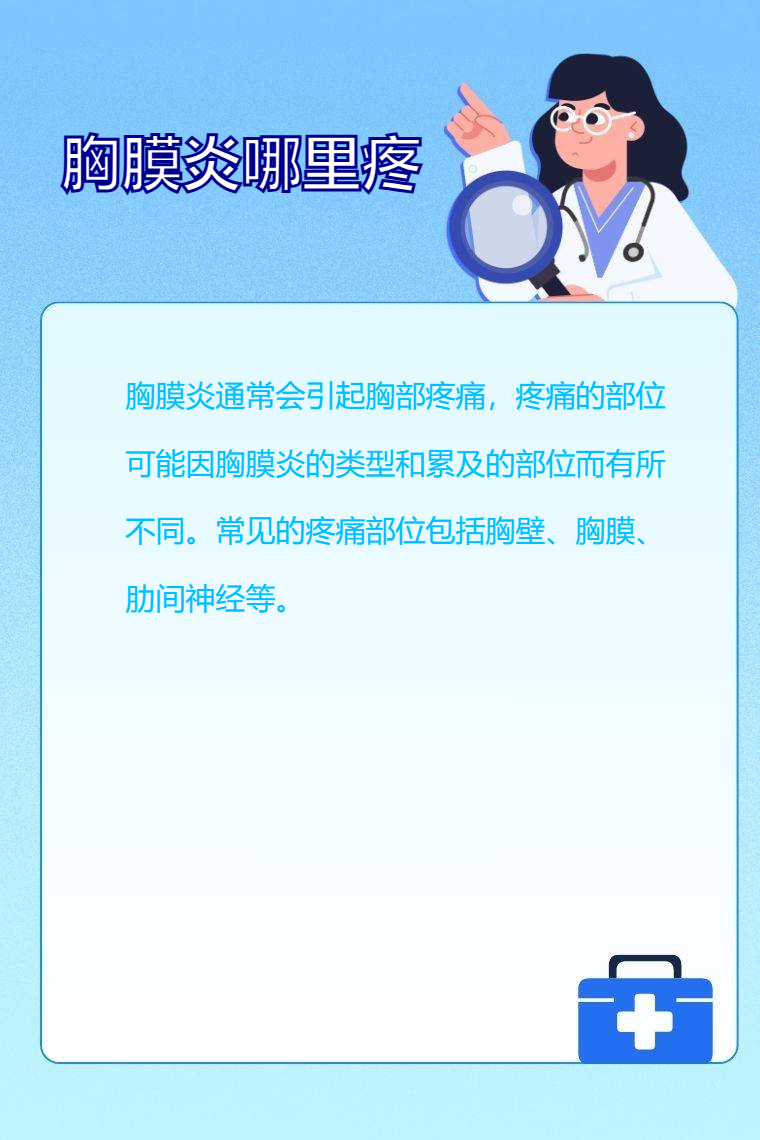 胸膜炎通常会引起胸部疼痛,疼痛的部位可能因胸膜炎的类型和累及的部位而有所不同。常见的疼痛部位包括胸壁、胸膜、肋间神经等,以下是一些可能的疼痛部位: