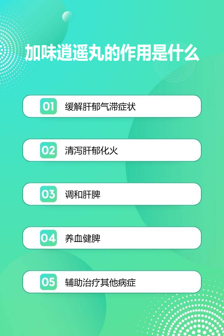 1. 缓解肝郁气滞症状:加味逍遥丸中的柴胡、薄荷等成分具有疏肝理气的作用,可有效缓解肝郁气滞所致的胸胁胀痛、郁闷不舒等症状。同时,对于因情绪不畅引起的头晕目眩、食欲不振、月经不调等也有一定的改善作用。