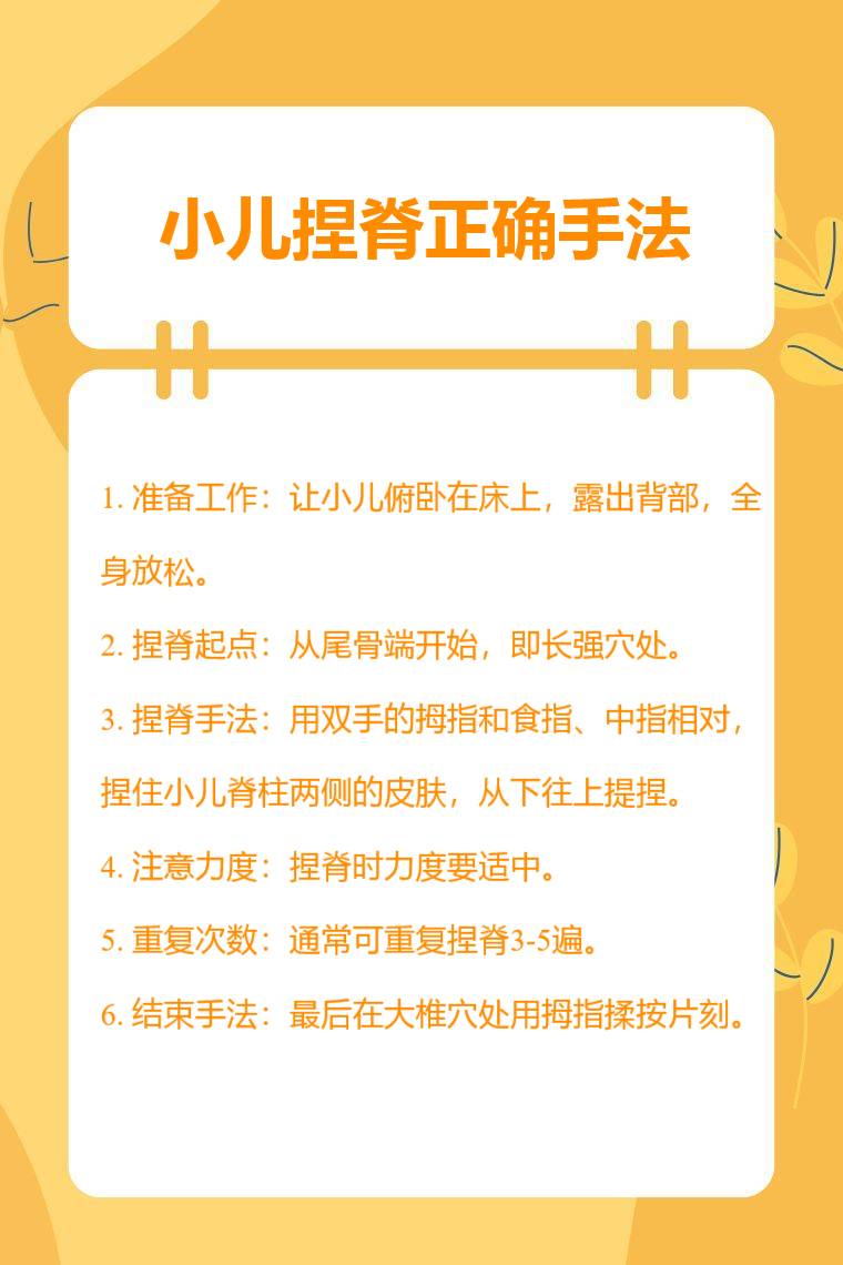 5. 重复次数:通常可重复捏脊3-5遍,根据小儿的具体情况和体质可适当增减。