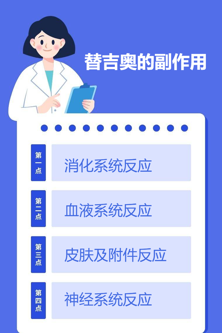 替吉奥的副作用主要包括消化系统反应、血液系统反应、皮肤及附件反应、神经系统反应等。