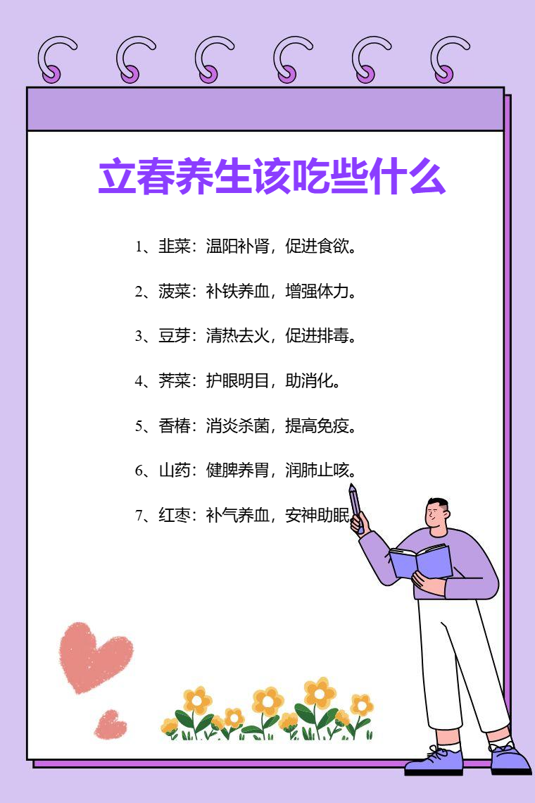 立春养生应该吃韭菜、菠菜、豆芽、荠菜、香椿、山药、红枣等食物。