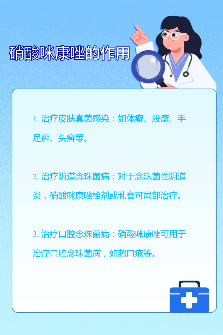 1. 治疗皮肤真菌感染:硝酸咪康唑可用于治疗由皮肤癣菌、酵母菌等引起的皮肤真菌感染,如体癣、股癣、手足癣、头癣等。