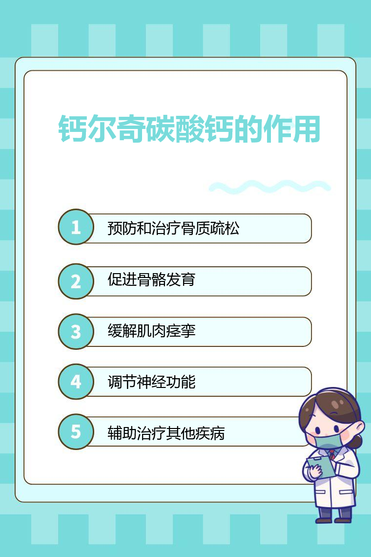 5. 辅助治疗其他疾病:一些疾病如高血压、糖尿病等,可能会导致钙代谢紊乱,补充钙尔奇碳酸钙可以辅助治疗这些疾病,改善患者的症状。