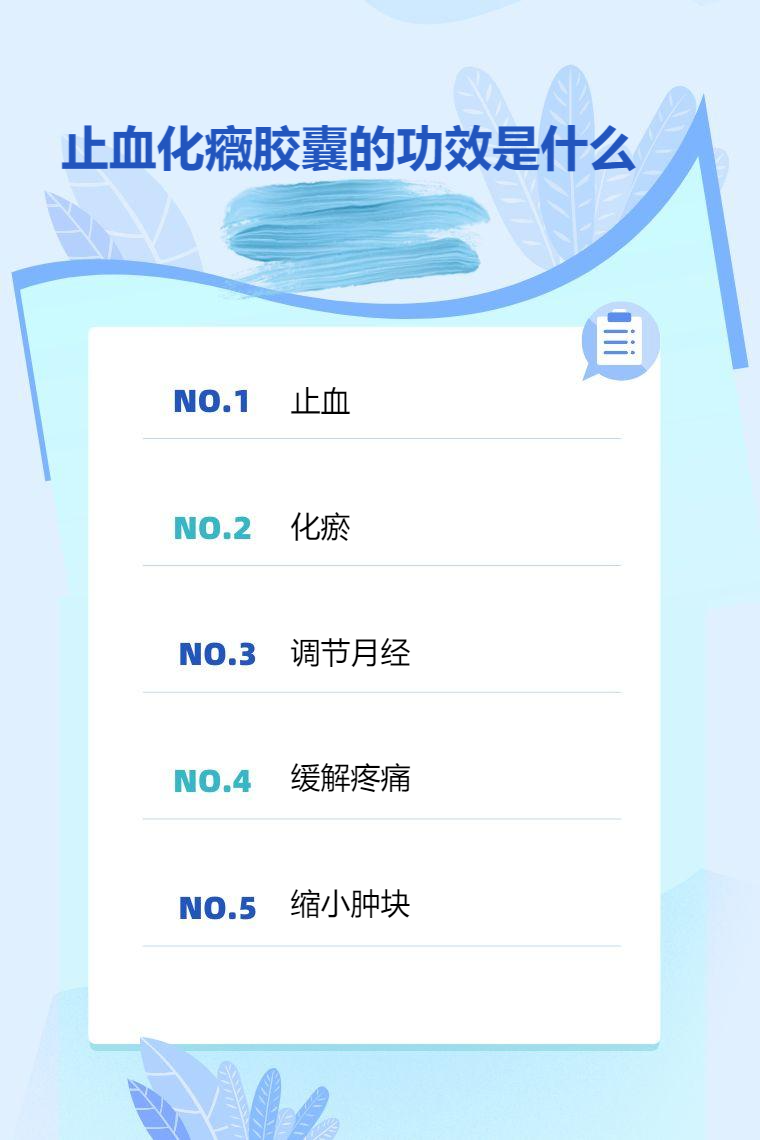 止血是止血化癓胶囊的主要功效之一。可以帮助缩短出血时间,减少出血量,适用于各种出血症状,如功能性子宫出血、月经过多、产后出血等。