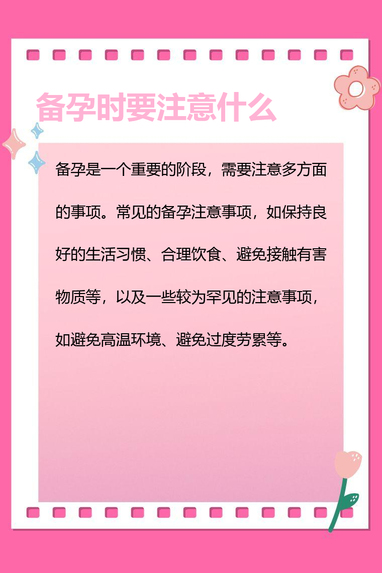 备孕是一个重要的阶段,需要注意多方面的事项。常见的备孕注意事项,如保持良好的生活习惯、合理饮食、避免接触有害物质等,以及一些较为罕见的注意事项,如避免高温环境、避免过度劳累等。