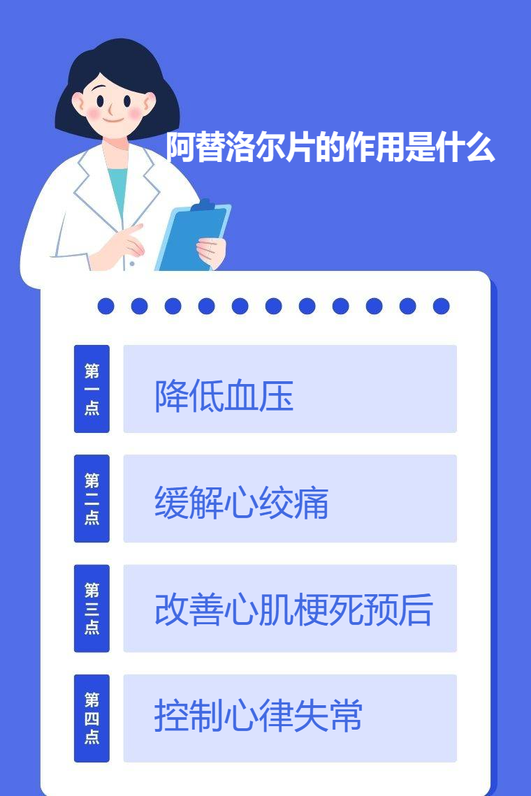 阿替洛尔片的作用包括降低血压、缓解心绞痛、改善心肌梗死预后、控制心律失常等。