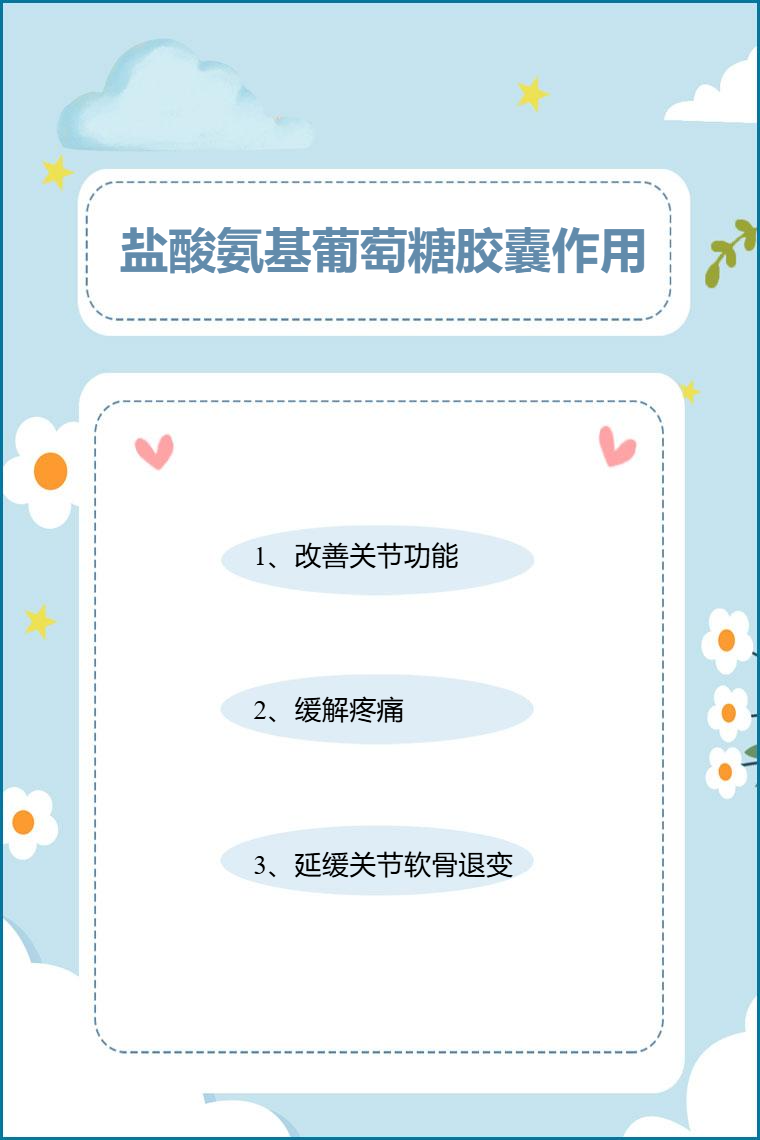 盐酸氨基葡萄糖胶囊作用主要包括改善关节功能、缓解疼痛、延缓关节软骨退变等。