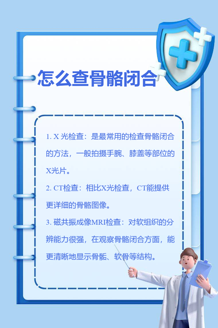 常见的查骨骼闭合的方法有X光检查、CT检查、磁共振成像MRI检查等。