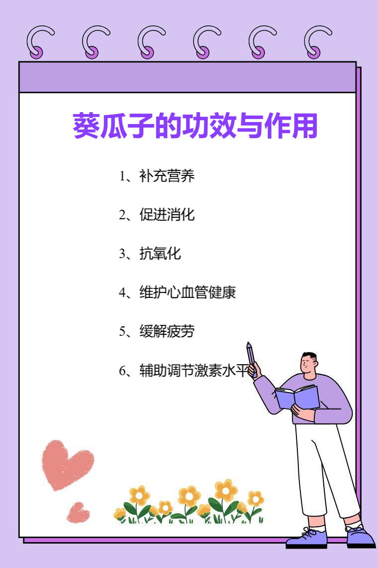 2. 促进消化:葵瓜子中的膳食纤维含量较高,适量食用可刺激肠道蠕动,帮助改善便秘问题,同时促进肠道有益菌群生长,维持消化系统正常功能。