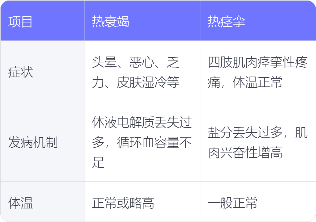 热衰竭和热痉挛是两种不同的热相关疾病,它们在症状、发病机制、体温等方面存在一些区别。
