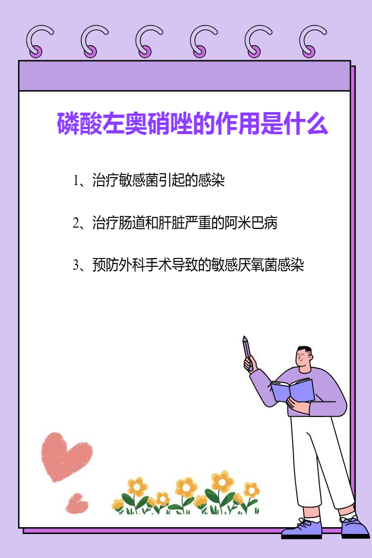 磷酸左奥硝唑的作用主要有治疗敏感菌引起的感染、治疗肠道和肝脏严重的阿米巴病、预防外科手术导致的敏感厌氧菌感染等。
