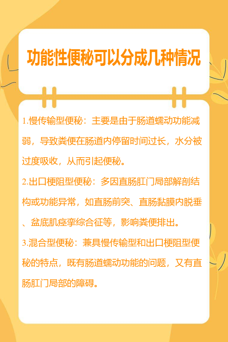 功能性便秘可以分成以下几种情况:慢传输型便秘、出口梗阻型便秘、混合型便秘等。