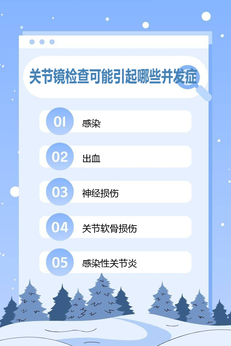 1. 感染:是关节镜检查较常见的并发症之一,可能导致局部红肿、疼痛、发热等症状,严重时可引起全身感染。