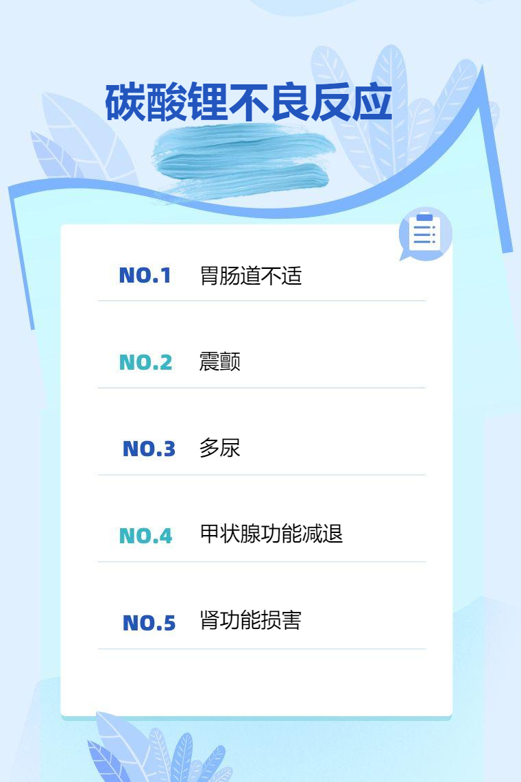 5. 肾功能损害:在极少数情况下,碳酸锂可能会对肾脏造成损害,导致肾功能异常。用药期间应定期检查肾功能,如发现异常应及时停药并采取相应的治疗措施。