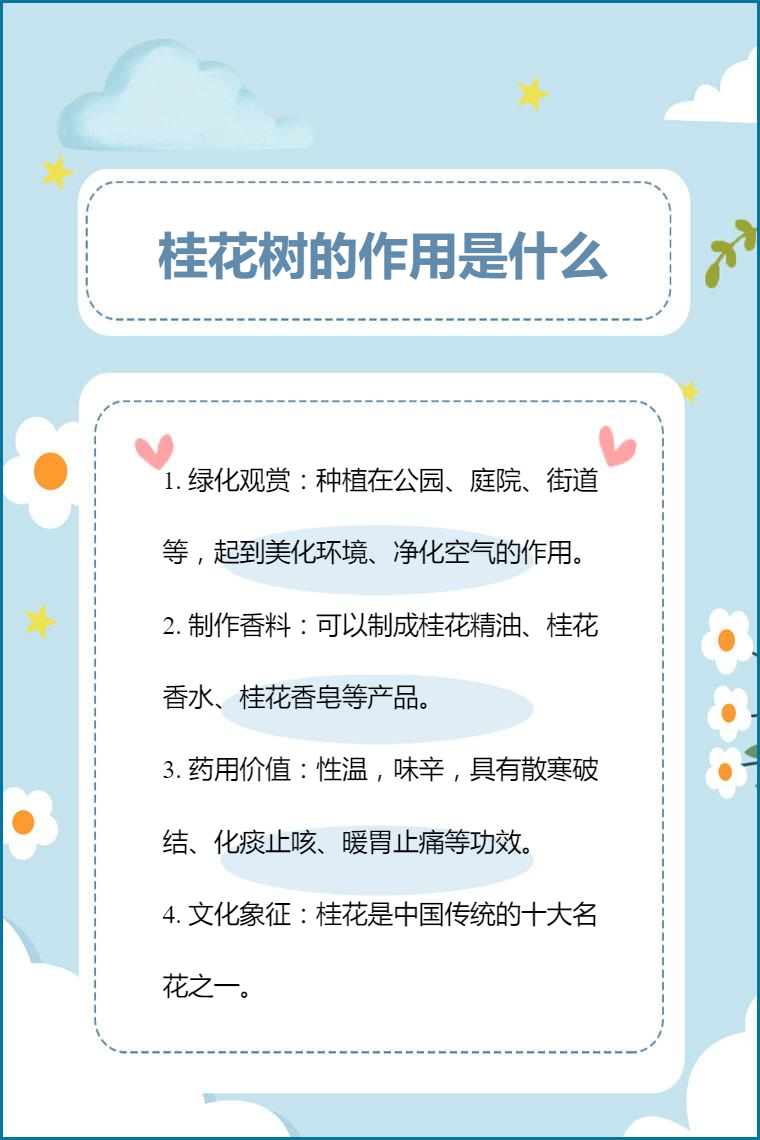 桂花树具有多种作用,包括绿化观赏、制作香料、药用价值、文化象征等。