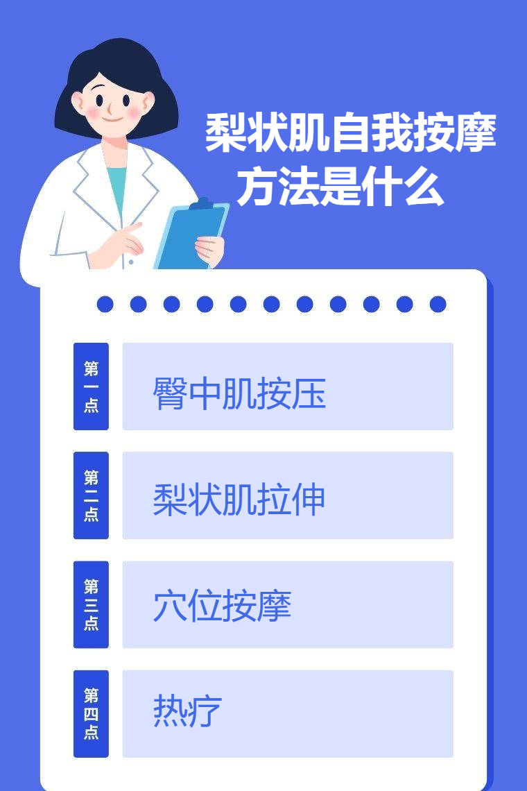 梨状肌自我按摩是缓解梨状肌紧张和疼痛的一种方法,包括臀中肌按压、梨状肌拉伸、穴位按摩、热疗等。