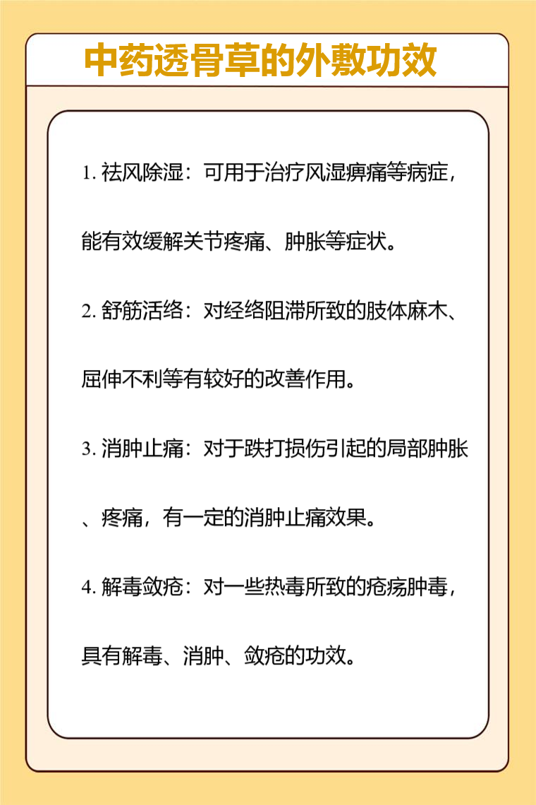 中药透骨草具有多种外敷功效,如祛风除湿、舒筋活络、消肿止痛等,在中医临床应用中较为广泛。