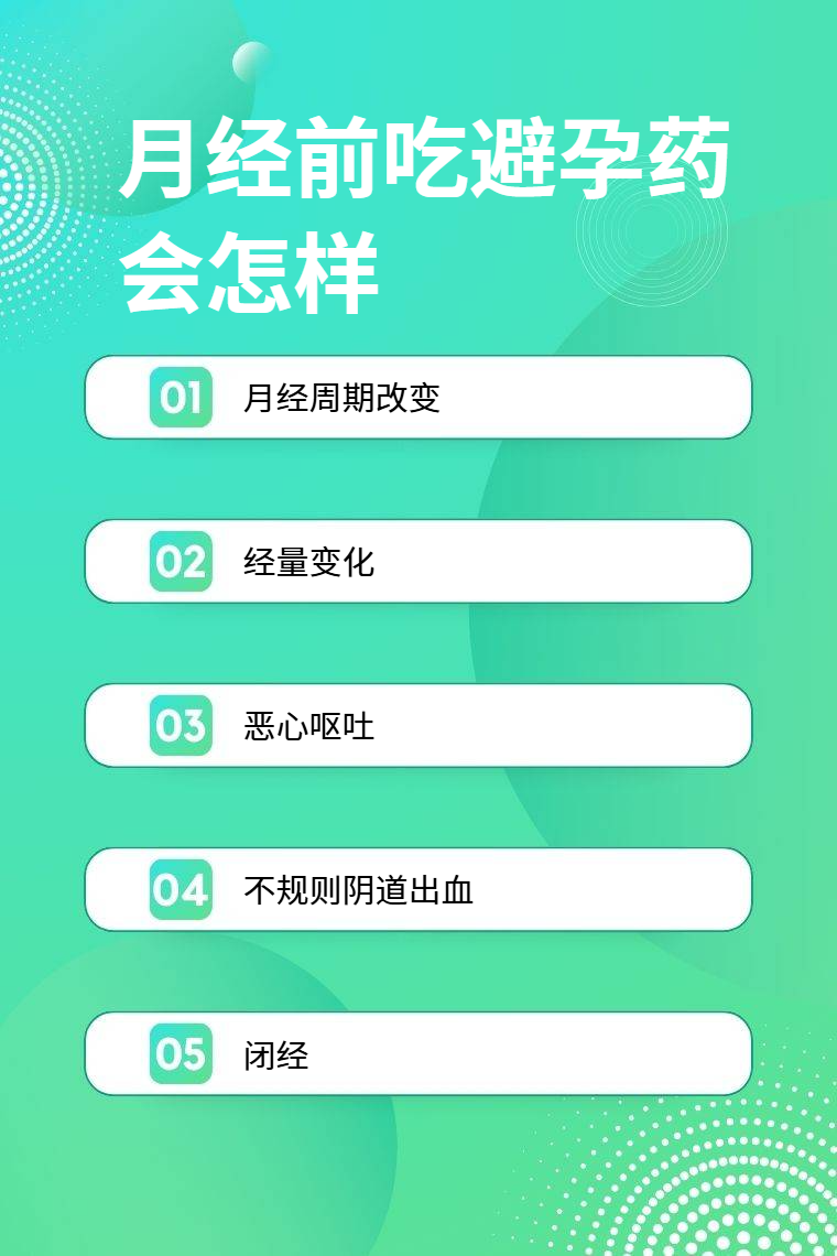 月经前吃避孕药可能出现月经周期改变、经量变化、恶心呕吐、不规则阴道出血、闭经等情况。