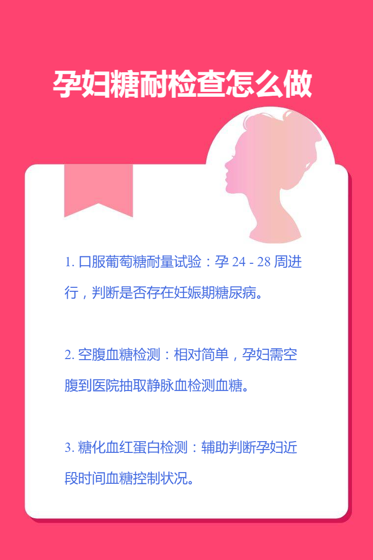 孕妇糖耐检查常见方式有口服葡萄糖耐量试验、空腹血糖检测、糖化血红蛋白检测等。