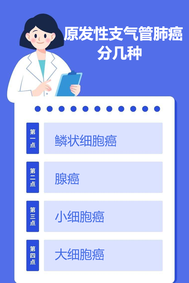 原发性支气管肺癌主要分为鳞状细胞癌、腺癌、小细胞癌、大细胞癌等。