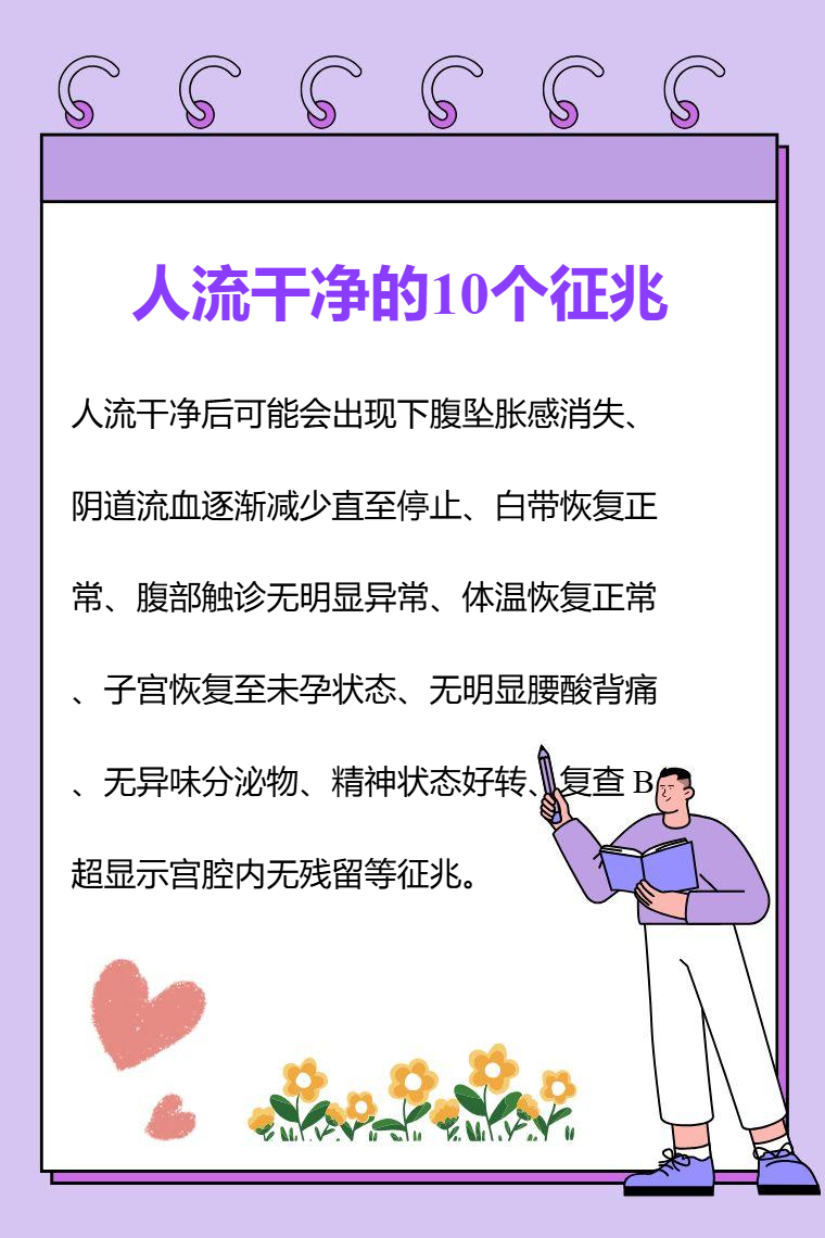 人流干净后可能会出现下腹坠胀感消失、阴道流血逐渐减少直至停止、白带恢复正常、腹部触诊无明显异常、体温恢复正常、子宫恢复至未孕状态、无明显腰酸背痛、无异味分泌物、精神状态好转、复查 B 超显示宫腔内无残留等