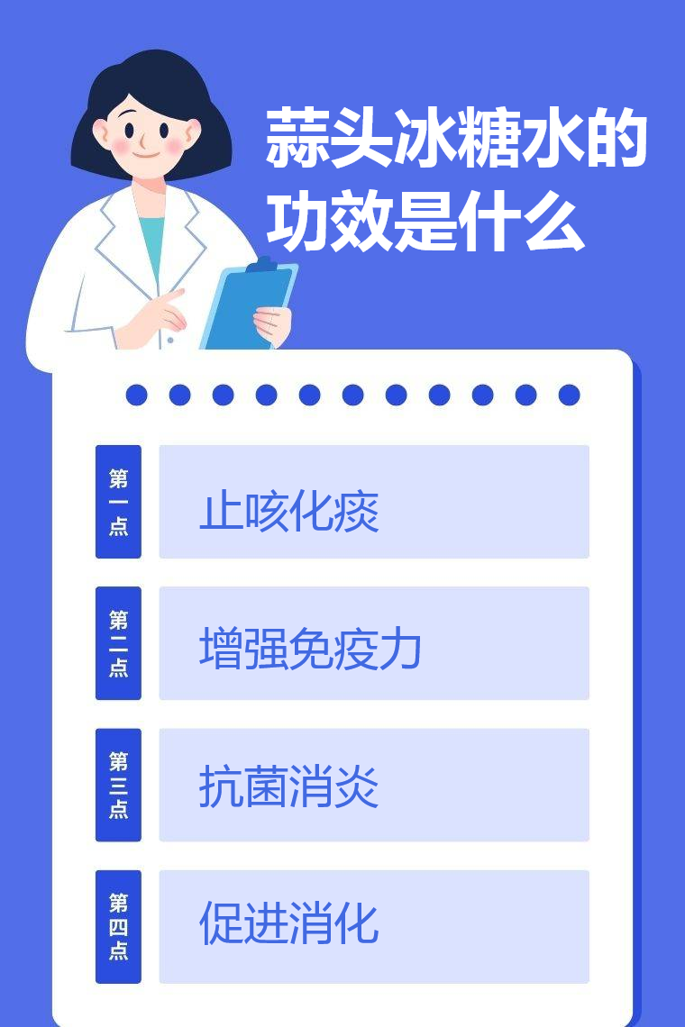 蒜头冰糖水具有多种功效,如止咳化痰、增强免疫力、抗菌消炎、促进消化等。