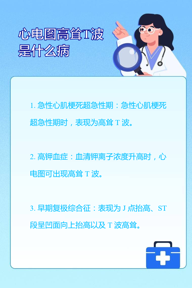 心电图高耸 T 波常见于急性心肌梗死超急性期、高钾血症、早期复极综合征等。