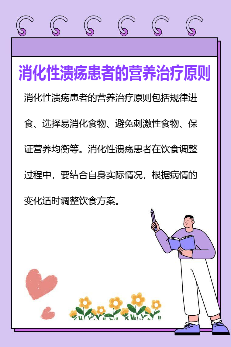 消化性溃疡患者的营养治疗原则包括规律进食、选择易消化食物、避免刺激性食物、保证营养均衡等。