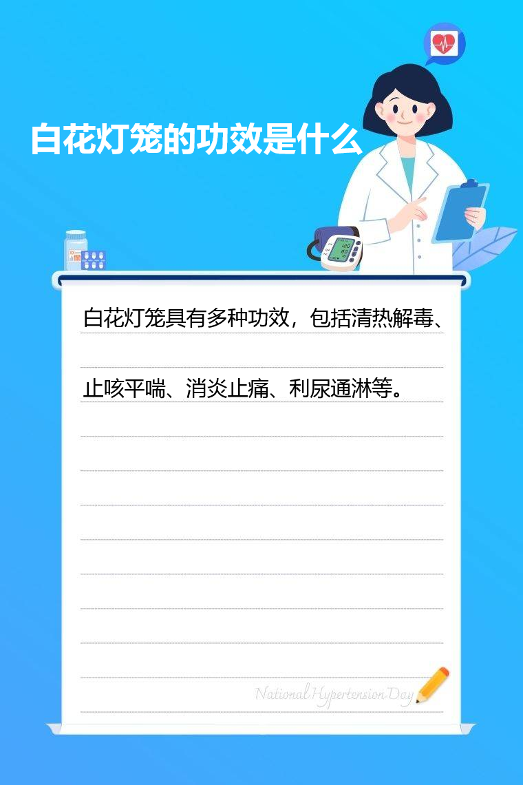 白花灯笼具有多种功效,包括清热解毒、止咳平喘、消炎止痛、利尿通淋等。