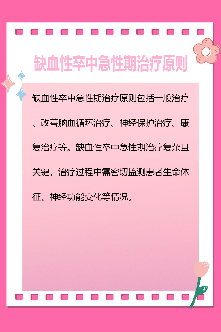 缺血性卒中急性期治疗原则包括一般治疗、改善脑血循环治疗、神经保护治疗、康复治疗等。
