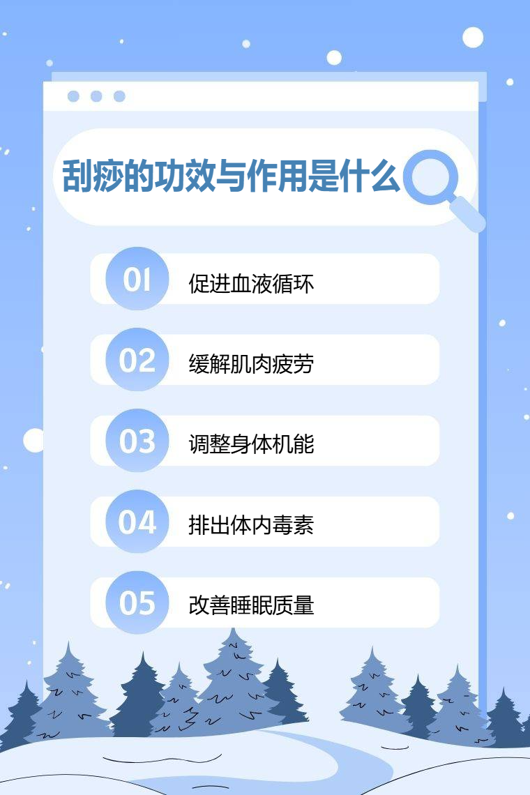 刮痧是一种传统的中医疗法,具有多种功效与作用,如促进血液循环、缓解肌肉疲劳、调整身体机能、排出体内毒素、改善睡眠质量等。